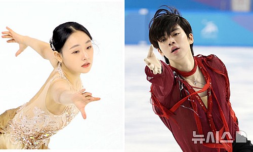 [하얼빈(중국)=뉴시스] 김선웅 기자 = 13일(현지 시간) 중국 하얼빈 헤이룽장 빙상훈련센터에서 열린 2025 하얼빈 동계 아시안게임 남녀 피겨스케이팅 싱글 각 종목에서 김채연(왼쪽)과 차준환이 각각 금메달을 차지했다. 2025.02.13. mangusta@newsis.com
