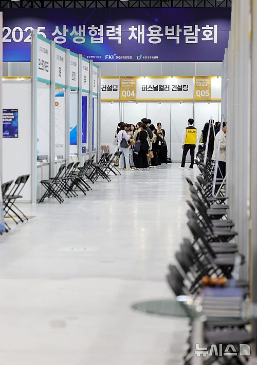 [서울=뉴시스] 홍효식 기자 = 21일 서울 강서구 코엑스마곡에서 열린 2025 상생협력 채용박람회 부스에 빈 의자가 구직자들을 기다리고 있다. 2025.10.21. yesphoto@newsis.com