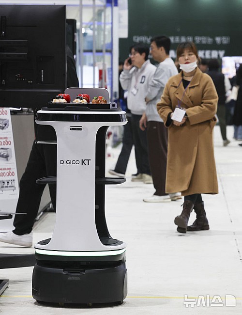 [서울=뉴시스] 김근수 기자 = 13일 서울 강남구 세텍에서 열린 프랜차이즈 박람회 2025에서 한 프랜차이즈 부스 앞에 서빙로봇이 음식을 나르고 있다. 2025.11.13. ks@newsis.com