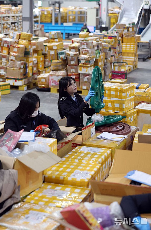 [인천공항=뉴시스] 김선웅 기자 = 20일 인천 중구 인천공항본부세관 특송물류센터에서 블랙프라이데이 등 해외직구 성수기를 맞아 관계자들이 분주하게 물량을 처리하고 있다. 2025.11.20. mangusta@newsis.com