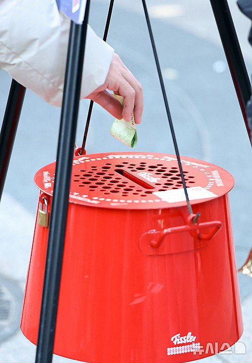 [서울=뉴시스] 최진석 기자 = 구세군 연말 모금 캠페인이 시작된 28일 서울 중구 명동거리에서 한 시민이 기부를 하고 있다. 2025.11.28. myjs@newsis.com