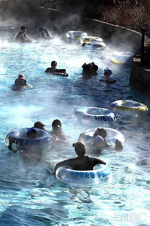 [용인=뉴시스] 김종택 기자 = 전국적으로 매서운 한파가 이어지고 있는 22일 경기 용인시 캐리비안 베이를 찾은 시민들이 수증기가 피어 오르는 야외 유수풀에서 즐거운 시간을 보내고 있다. 2026.01.22. jtk@newsis.com