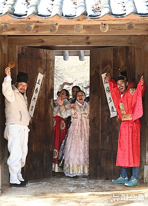 [용인=뉴시스] 김종택 기자 = 절기상 입춘을 이틀 앞둔 2일 경기 용인시 한국민속촌에서 외국인 관광객들이 입춘첩을 대문에 붙이고 있다.
