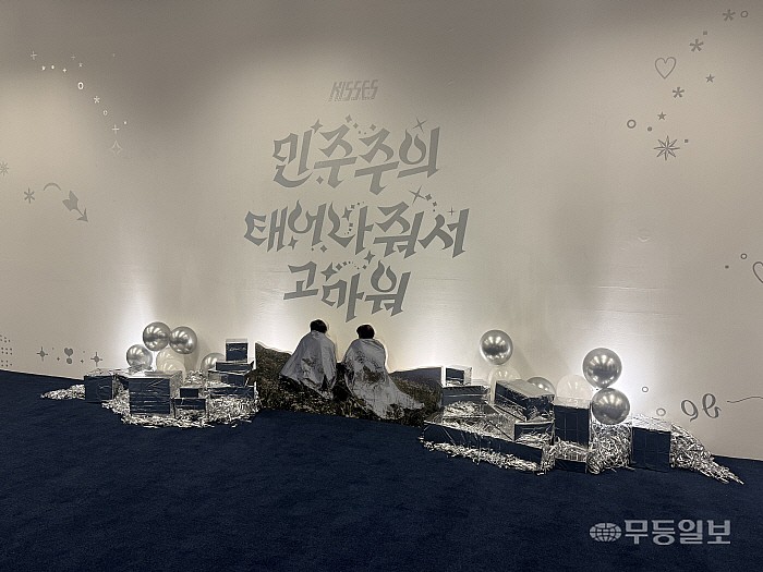 민주주의를 주제로 꾸려진 이 ‘생카’ 현장에는 팬덤 활동에서 빠질 수 없는 창작 소설(팬픽)과 컵홀더, 포카홀더 등 다양한 굿즈들이 관객을 맞이한다. 특히 아이돌 그룹명인 ‘키세스’는 실제 한남동 대통령 관저 앞에서 집회를 열었던 이른바 ‘키세스 시위대’의 명칭을 가져와 의미를 더했다.