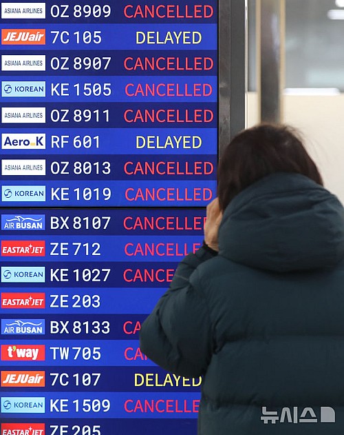 [제주=뉴시스] 우장호 기자 = 제주 지역 강설로 제주공항 활주로가 임시 폐쇄된 8일 오전 제주국제공항 3층 출발장에 제주를 떠나려는 이용객들의 발걸음이 이어지고 있다. 2026.02.08. woo1223@newsis.com