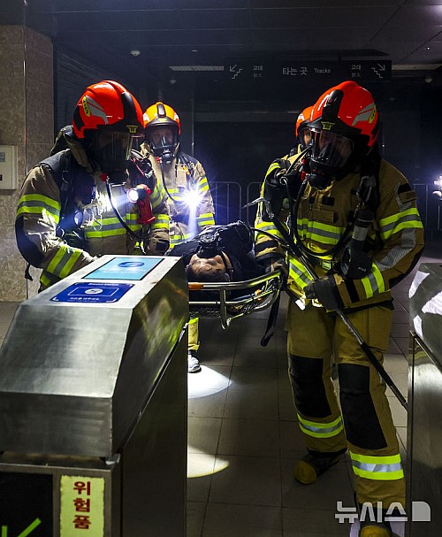 [서울=뉴시스] 정병혁 기자 = 26일 서울 은평구 서울소방학교에서 열린 서울소방재난본부, 미래형 재난대응 체계 공개 시연에서 사족보행로봇 발견한 부상자를 소방대원들이 구조하고 있다. 2026.02.26. jhope@newsis.com